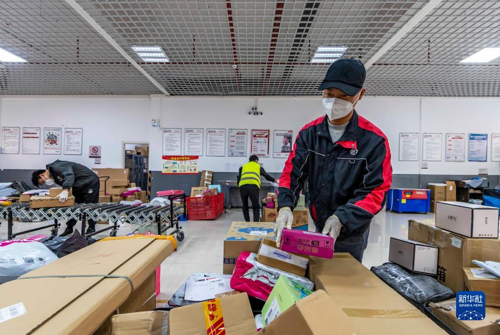 11月12日,在貴州省黔西市同心商貿城順豐速運營(yíng)業(yè)點(diǎn),快遞員在分揀包裹。