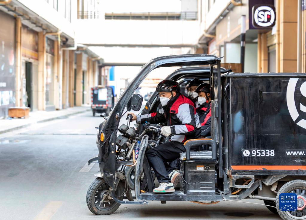 11月12日,在貴州省黔西市同心商貿城順豐速運營(yíng)業(yè)點(diǎn),快遞員出發(fā)派送包裹。