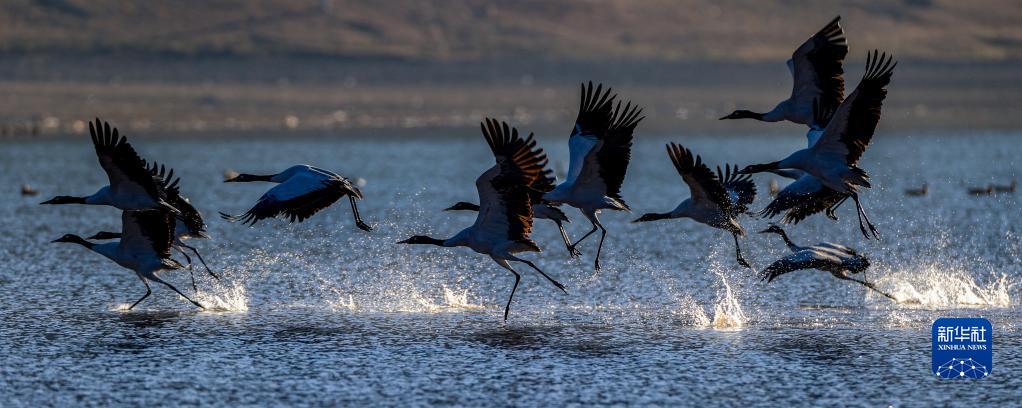 這是在西藏拉薩林周縣虎頭山水庫拍攝的黑頸鶴(11月6日攝)。