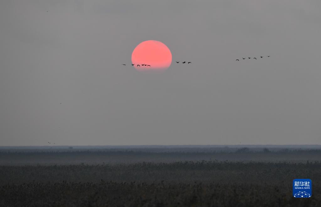 這是江蘇鹽城濕地珍禽國家級自然保護區日出景色(11月8日攝)。