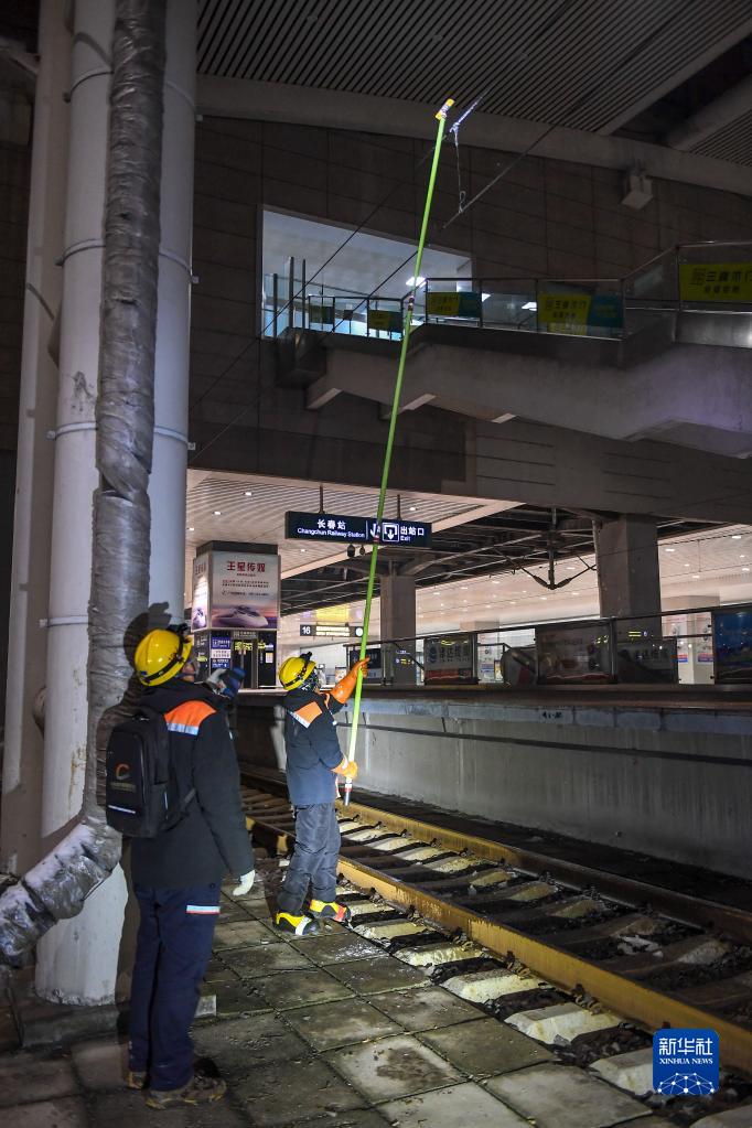 11月13日,在長(cháng)春火車(chē)站,中國鐵路沈陽(yáng)局集團有限公司長(cháng)春高鐵基礎設施段工作人員清理接觸網(wǎng)上的結冰。