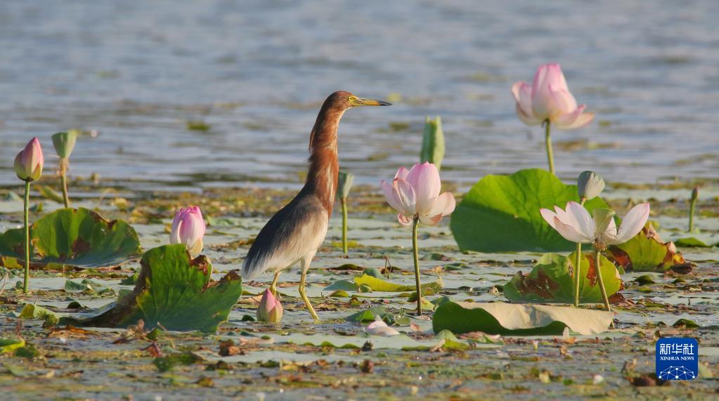 一只黃葦鳽在哈爾濱大劇院附近的濕地荷塘內覓食(2021年7月17日攝)。