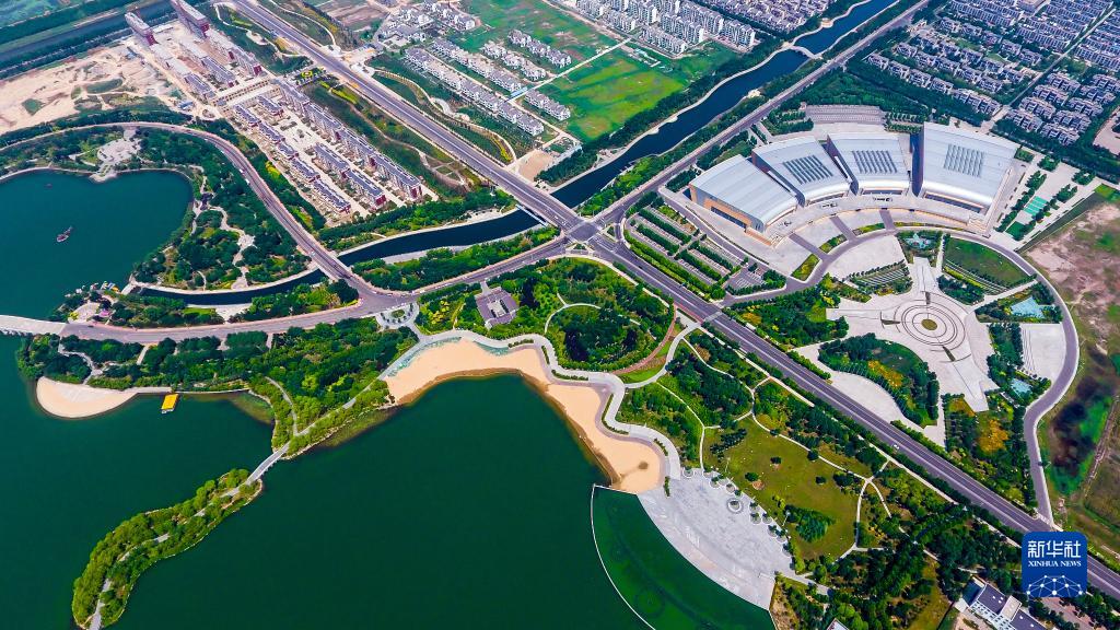 東營(yíng)市墾利區民豐湖公園景色(2018年6月24日攝,無(wú)人機照片)。