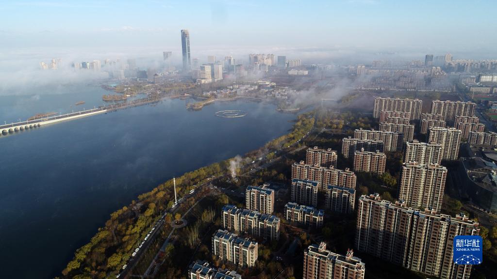 這是2022年11月12日拍攝的寧夏銀川市閱海國家濕地公園(無(wú)人機照片)。