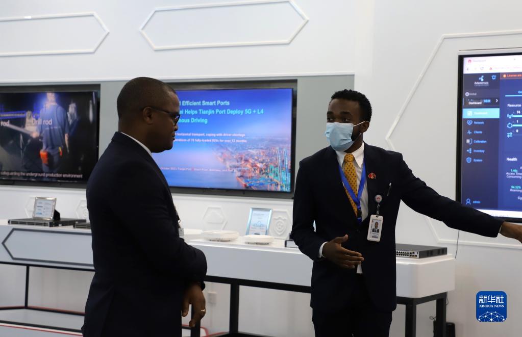 11月14日,在安哥拉羅安達的華為安哥拉科技園區,華為本地員工為到訪(fǎng)嘉賓進(jìn)行產(chǎn)品介紹。