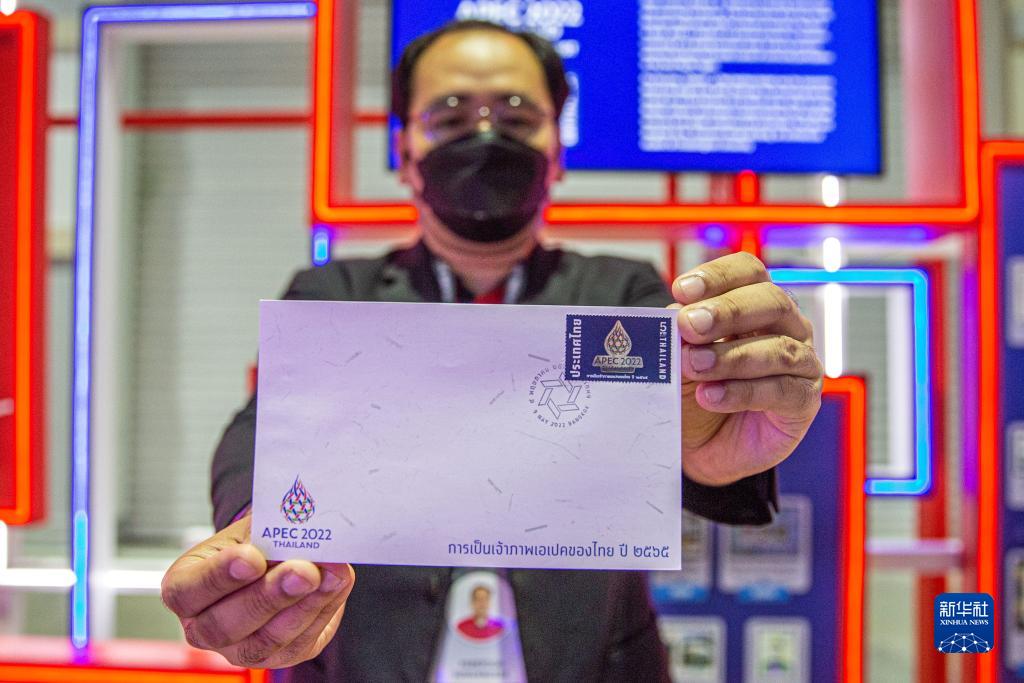 11月16日,一名工作人員在泰國曼谷2022年亞太經(jīng)合組織會(huì )議媒體中心展示紀念郵封。