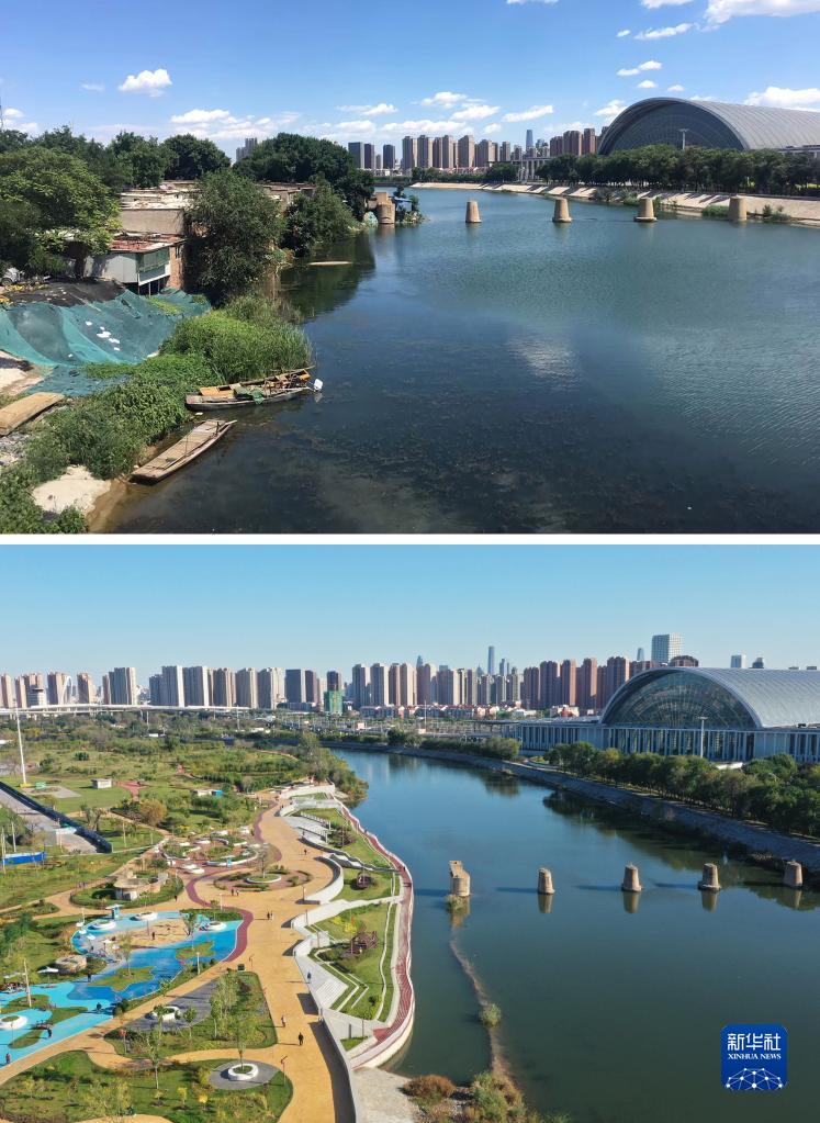 拼版照片:上圖為天津市紅橋區子牙河北岸搬遷改造前的“漁村”一角(資料照片);下圖為2021年10月11日拍攝的天津市紅橋區子牙河濱河公園一景(無(wú)人機照片)。