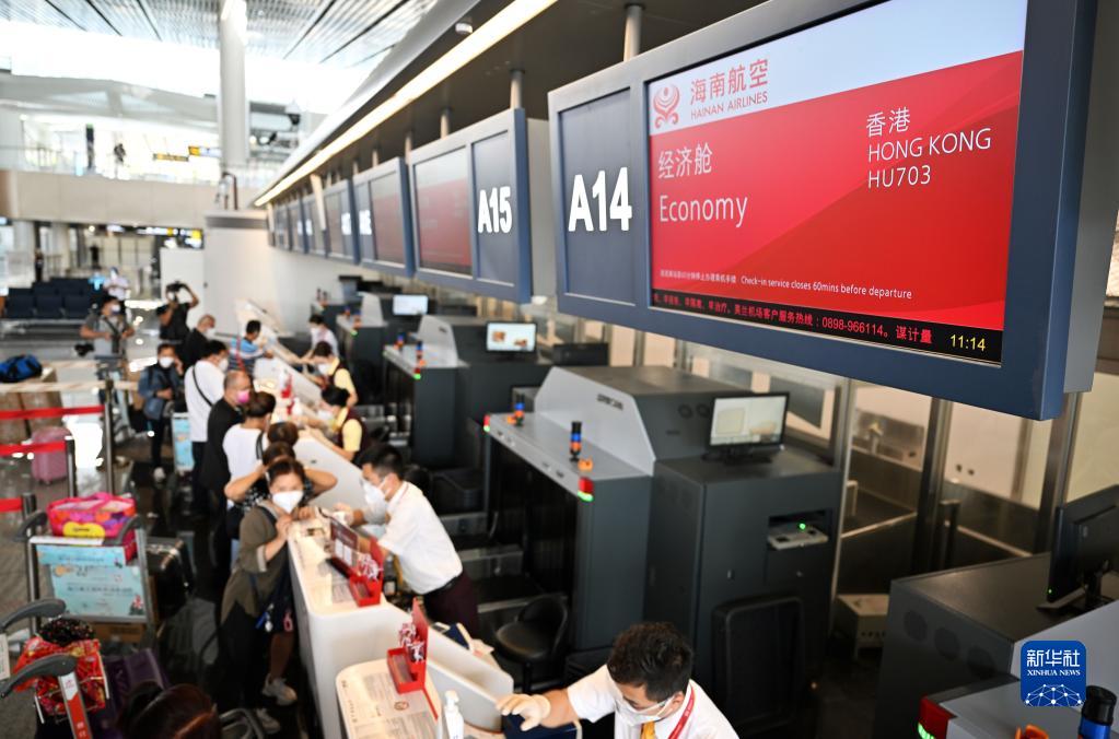 11月16日,準備乘坐海航班機前往香港的旅客在??诿捞m國際機場(chǎng)辦理登機手續。