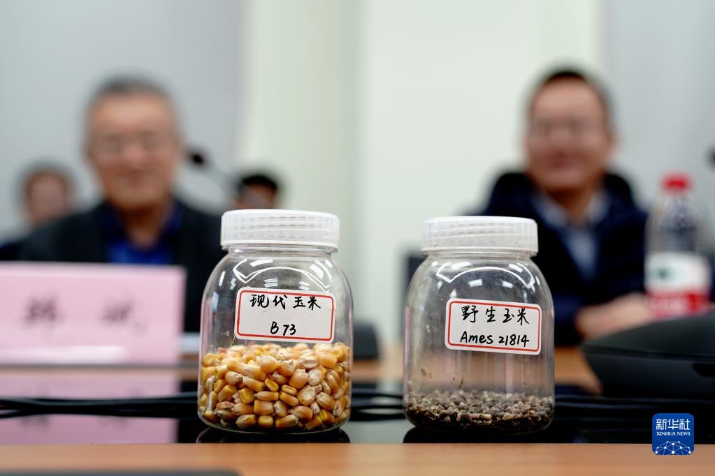 11月16日在中國科學(xué)院分子植物科學(xué)卓越創(chuàng )新中心拍攝的野生玉米種子和現代玉米種子。