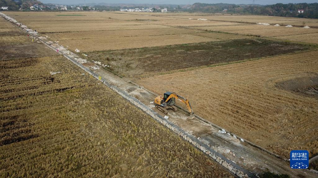 11月17日,在湘潭市湘鄉市泉塘鎮雙江村,工人使用機械修建機耕道(無(wú)人機照片)。