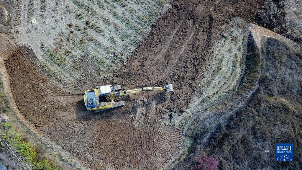 11月17日,在湘潭市湘鄉市梅橋鎮梅橋村,工人使用機械平整土地(無(wú)人機照片)。