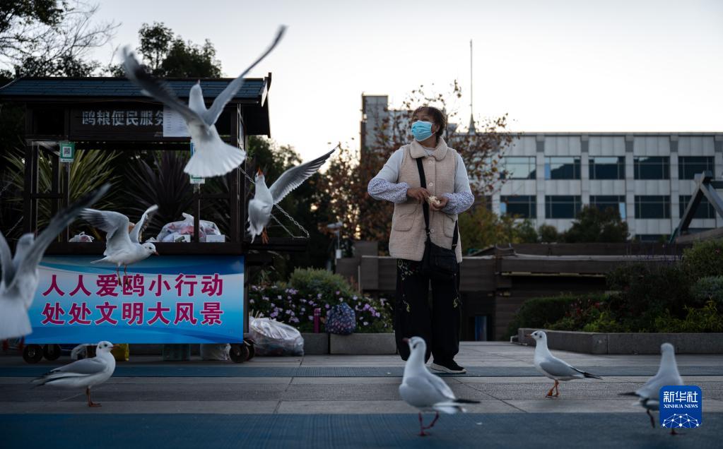 11月18日,市民在海埂大壩投喂紅嘴鷗。