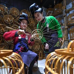 在貴州省丹寨縣龍泉鎮卡拉村的鳥(niǎo)籠文創(chuàng )工坊,苗族手工藝人在編制鳥(niǎo)籠(11月16日攝)。