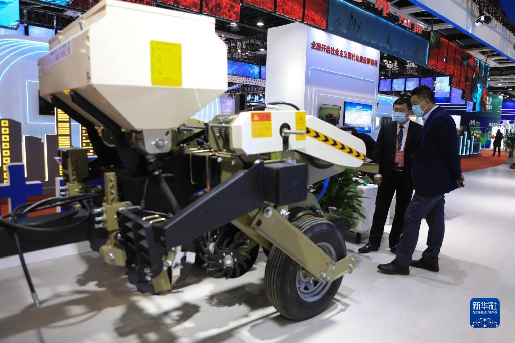 11月18日,人們在洽談會(huì )期間舉行的“綠色智造產(chǎn)業(yè)產(chǎn)品展”上參觀(guān)展出的農機。