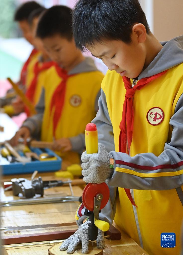 11月17日,天津市和平區中心小學(xué)的學(xué)生在上木工課。