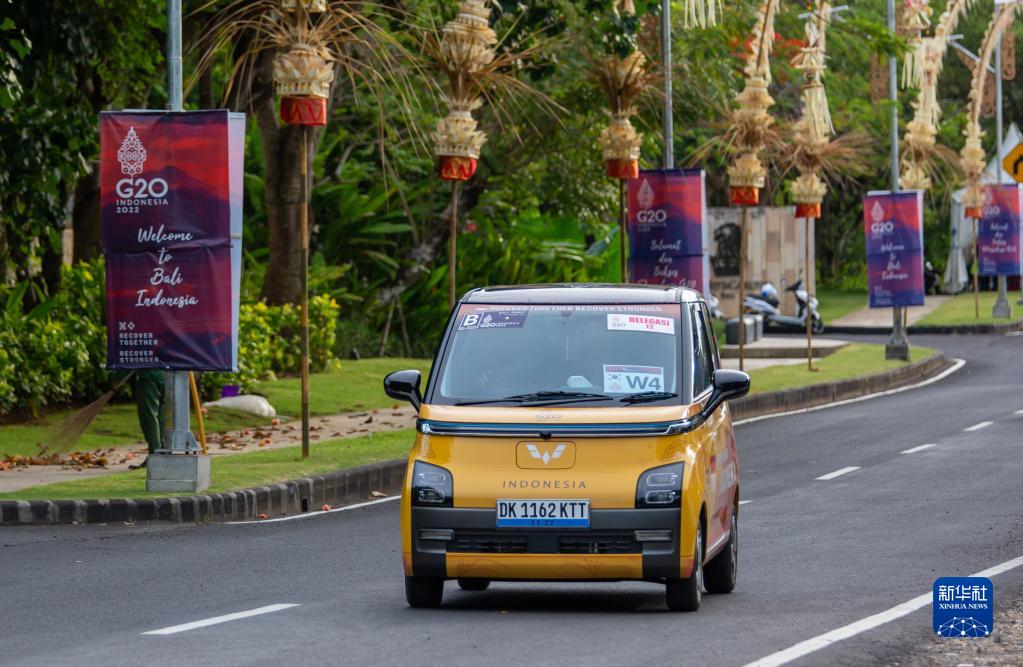 11月12日,二十國集團領(lǐng)導人第十七次峰會(huì )官方用車(chē)五菱新能源汽車(chē)Air ev行駛在印度尼西亞巴厘島的道路上。