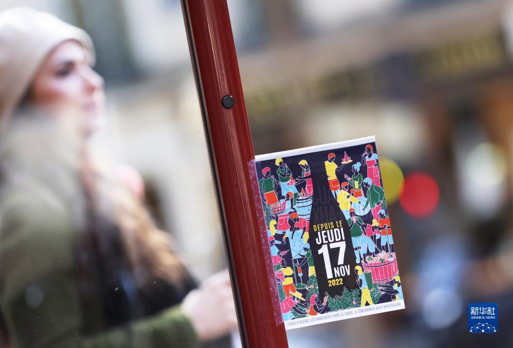 11月17日,法國巴黎一家餐館外張貼著(zhù)“博若萊新酒上市”的廣告。