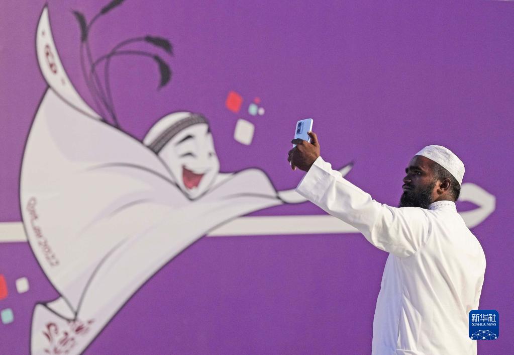 11月18日,游人在世界杯吉祥物背景墻前自拍。