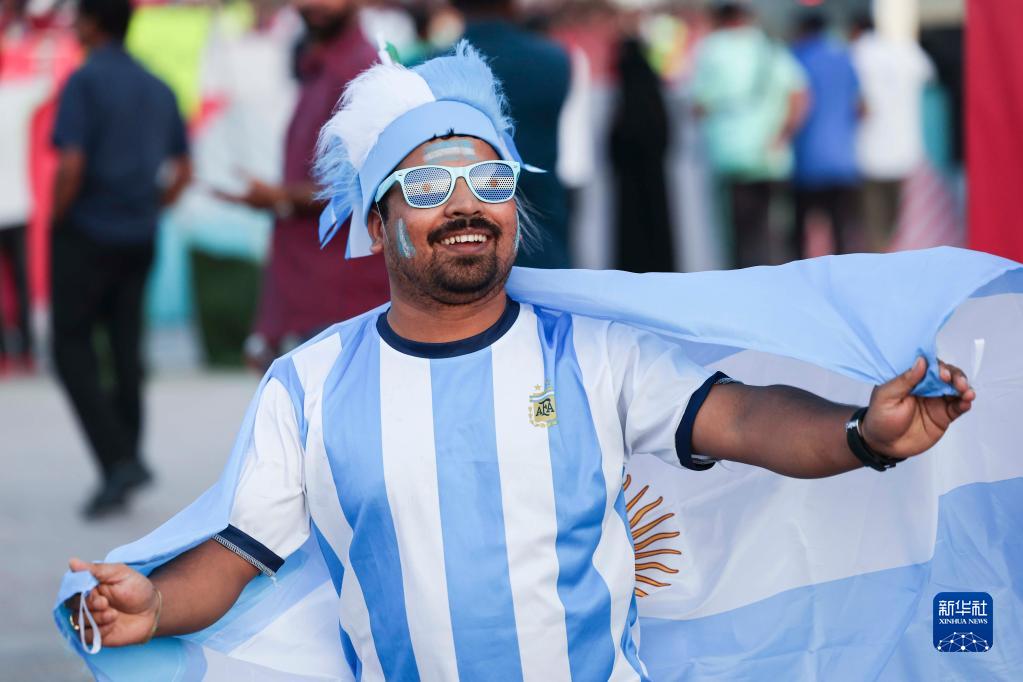 11月18日,一名阿根廷隊球迷在卡塔爾多哈的濱海大道留影。