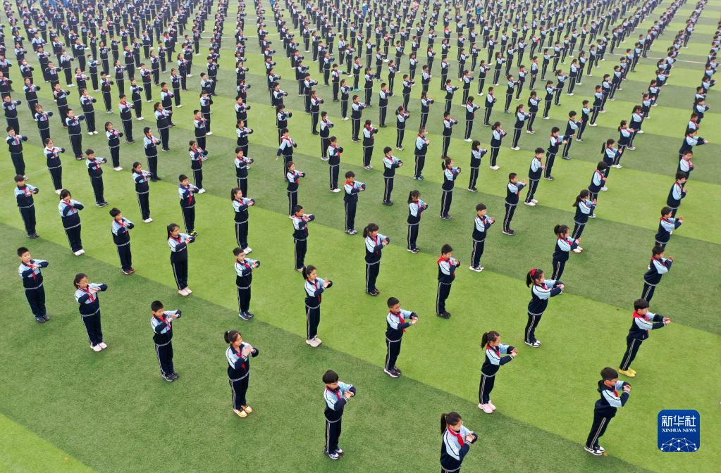 天津師范大學(xué)第三附屬小學(xué)的學(xué)生在操場(chǎng)上做武術(shù)健身操(11月18日攝,無(wú)人機照片)。