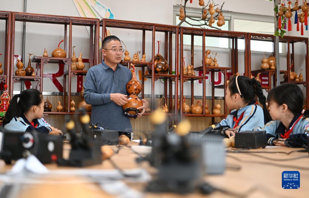 在天津師范大學(xué)第三附屬小學(xué),老師向學(xué)生講解葫蘆烙畫(huà)的技巧(11月18日攝)。