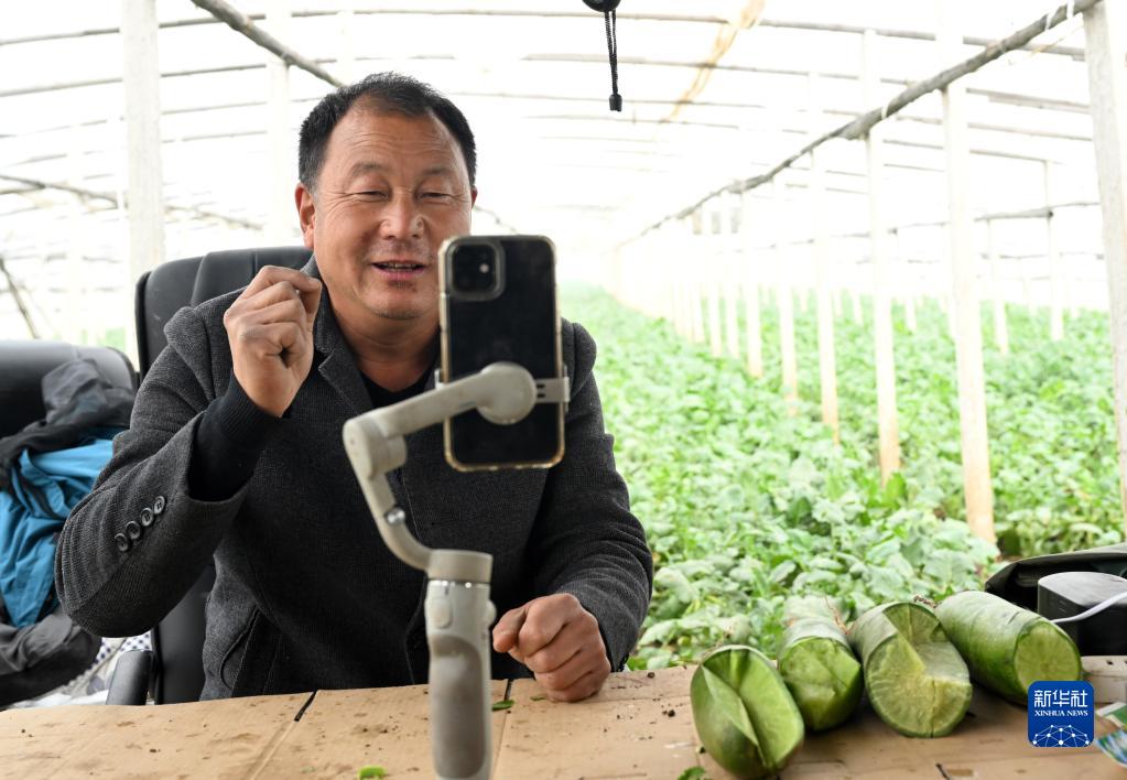 在天津市西青區辛口鎮種植沙窩蘿卜的大棚內,農民郭芝振通過(guò)手機直播推介沙窩蘿卜(11月18日攝)。