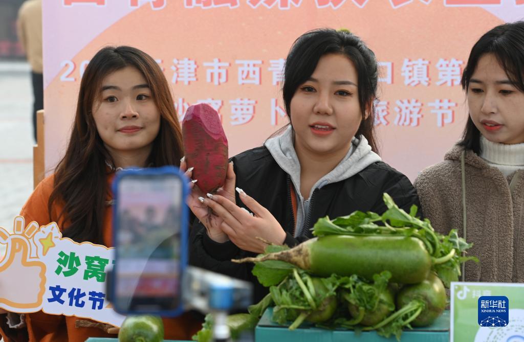 在天津市西青區辛口鎮第十五屆沙窩蘿卜文化旅游節上,網(wǎng)絡(luò )主播在直播間推介沙窩蘿卜(11月18日攝)。