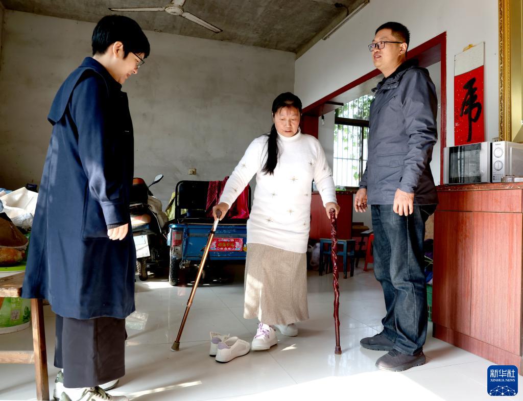 11月15日,泰州市人民醫院主治醫生孫旭(右)和康復醫生許新旋(左)在姚林芳家中為姚林芳檢查假肢安裝情況。姚林芳雙腳從小殘疾,只能匍匐爬行。她在《坡子街》副刊上發(fā)表了一篇《誰(shuí)能說(shuō)匍匐前行不是前行》的文章,講述四十多年來(lái)她和命運抗爭的故事,感動(dòng)了眾多讀者。泰州市人民醫院主動(dòng)向她伸出援助之手,免費為她治好了困擾她多年的褥瘡,給她做了雙下肢截肢手術(shù),并安裝了假肢。姚林芳現在已可以借助拐杖直立行走。