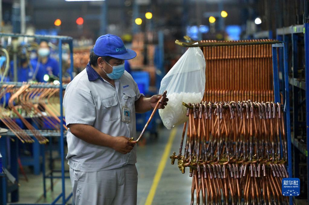 11月8日,在位于泰國羅勇府的泰中羅勇工業(yè)園,泰國工程師那塔武在盾安金屬(泰國)有限公司生產(chǎn)線(xiàn)上工作。