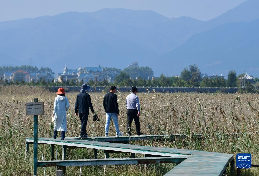 張潮巨和同事在閩江河口濕地核心區域觀(guān)測濕地植被生長(cháng)狀況(11月19日攝)。