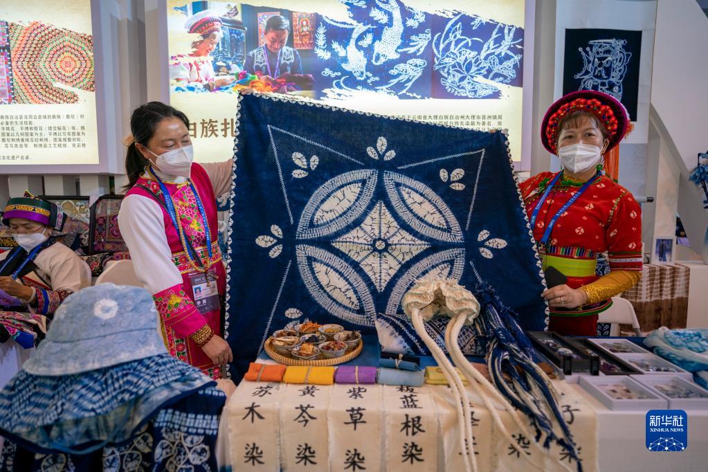 11月20日,扎染技藝傳承人在南博會(huì )旅游文化館內展示扎染作品。