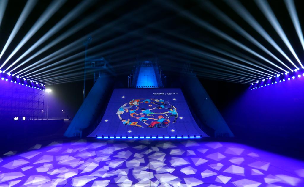 11月20日,北京首鋼滑雪大跳臺為世界兒童日亮燈。