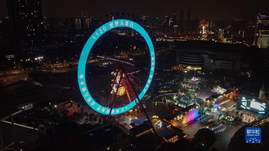 11月20日,長(cháng)沙世界之窗的摩天輪為世界兒童日亮燈(無(wú)人機照片)。