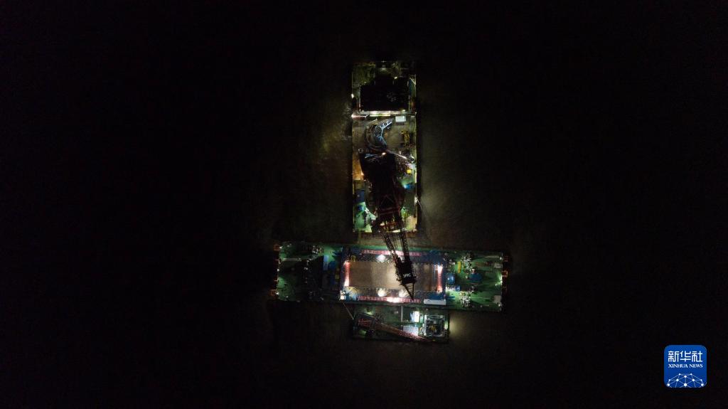 11月20日拍攝的長(cháng)江口二號古船整體打撈出水施工現場(chǎng)(無(wú)人機照片)。