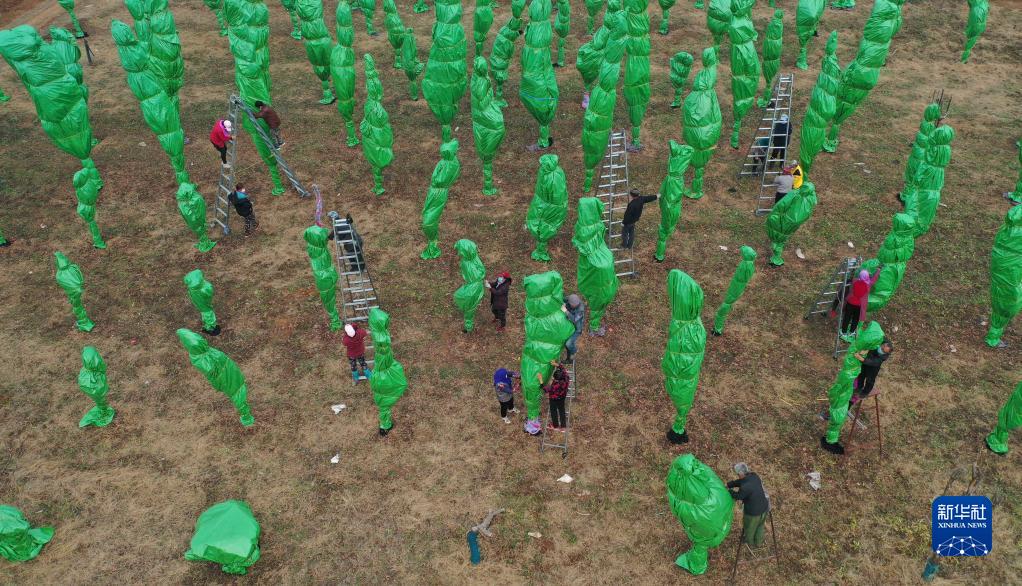 11月21日,在河北省遵化市劉備寨鄉,農民在苗木培育基地包裹景觀(guān)樹(shù)木御寒防凍(無(wú)人機照片)。