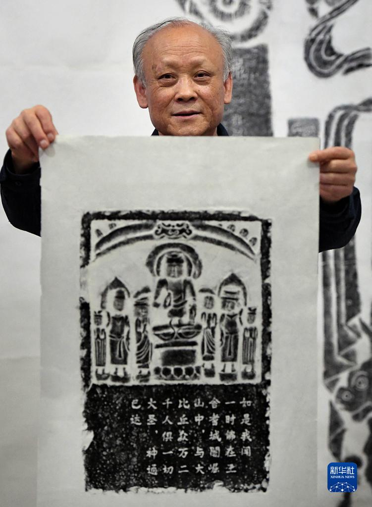 在位于鄭州市金水區文化館的工作室里,李仁清展示拓印作品(11月16日攝)。