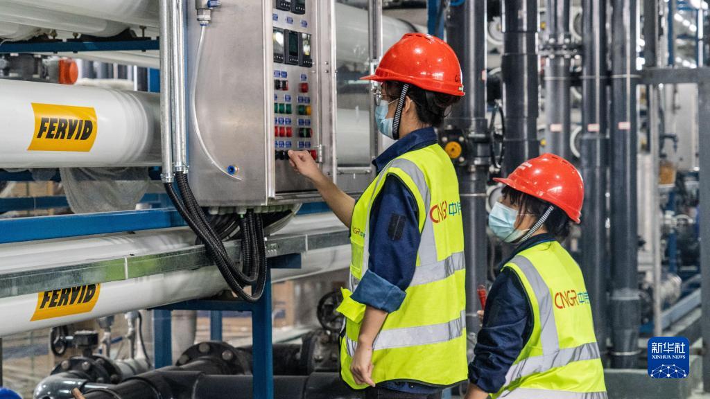 在廣西中偉新能源科技有限公司生產(chǎn)車(chē)間,兩名黨員突擊隊員在操控生產(chǎn)線(xiàn)生產(chǎn)(2021年11月17日攝)。
