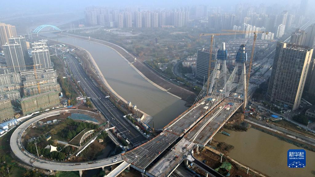 這是正在進(jìn)行主塔封頂施工的引江濟淮金寨南路橋(11月24日攝,無(wú)人機照片)。