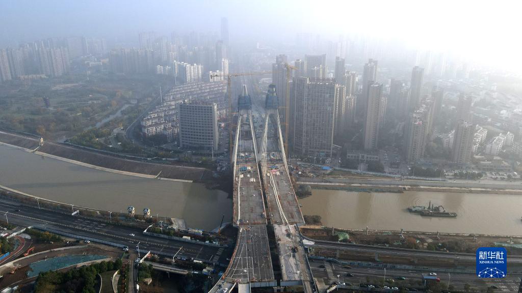 這是正在進(jìn)行主塔封頂施工的引江濟淮金寨南路橋(11月24日攝,無(wú)人機照片)。