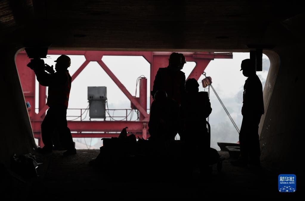 11月24日,在渝昆高鐵瀘宜段架梁施工現場(chǎng),施工人員在箱梁內部施工。