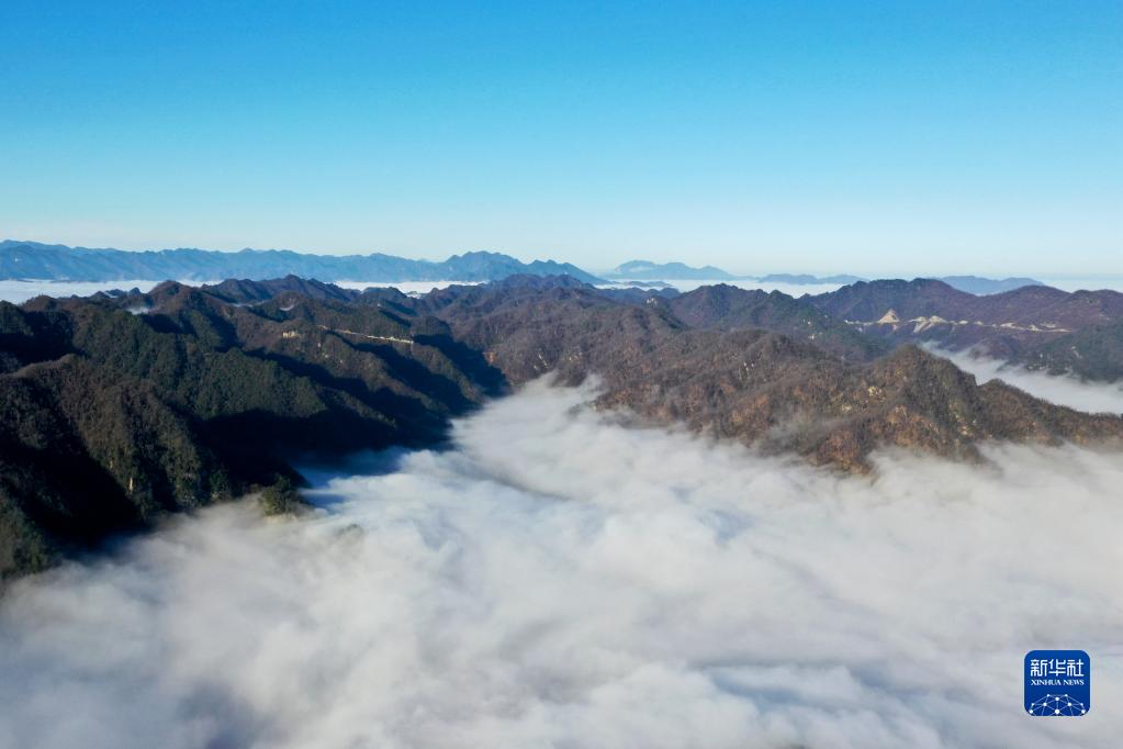 11月24日在湖北省襄陽(yáng)市??悼h馬橋鎮梨花山拍攝的云海(無(wú)人機照片)。