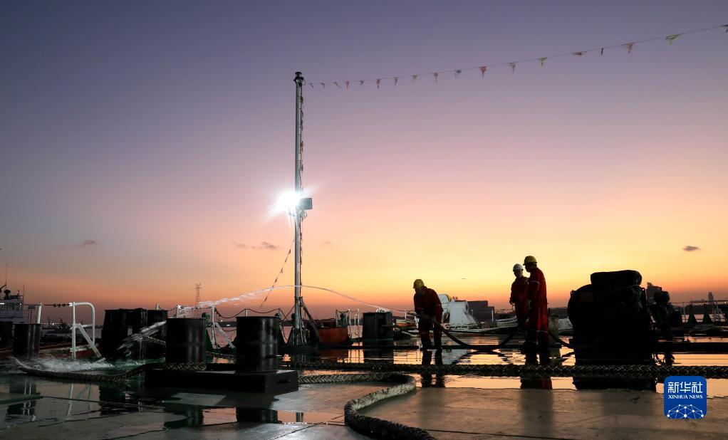 11月24日,工作人員在啟航前清洗“奮力”輪甲板。