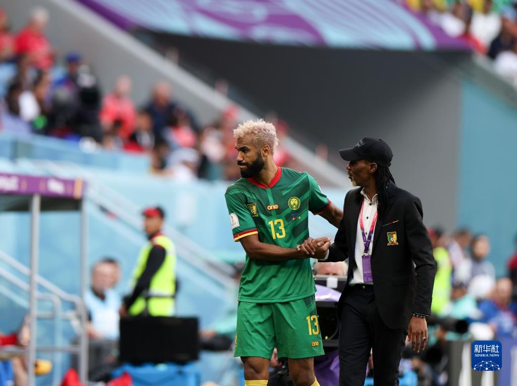 11月24日,喀麥隆隊主教練里格貝特·宋(右)與被替換下場(chǎng)的球員舒波-莫廷交流。