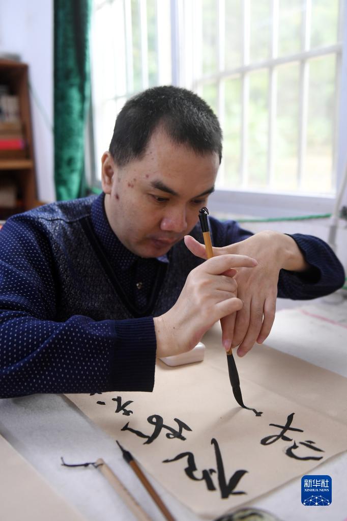 11月24日,在都安瑤族自治縣大興鎮九頓村那內屯家里,王金寶在練習書(shū)法。