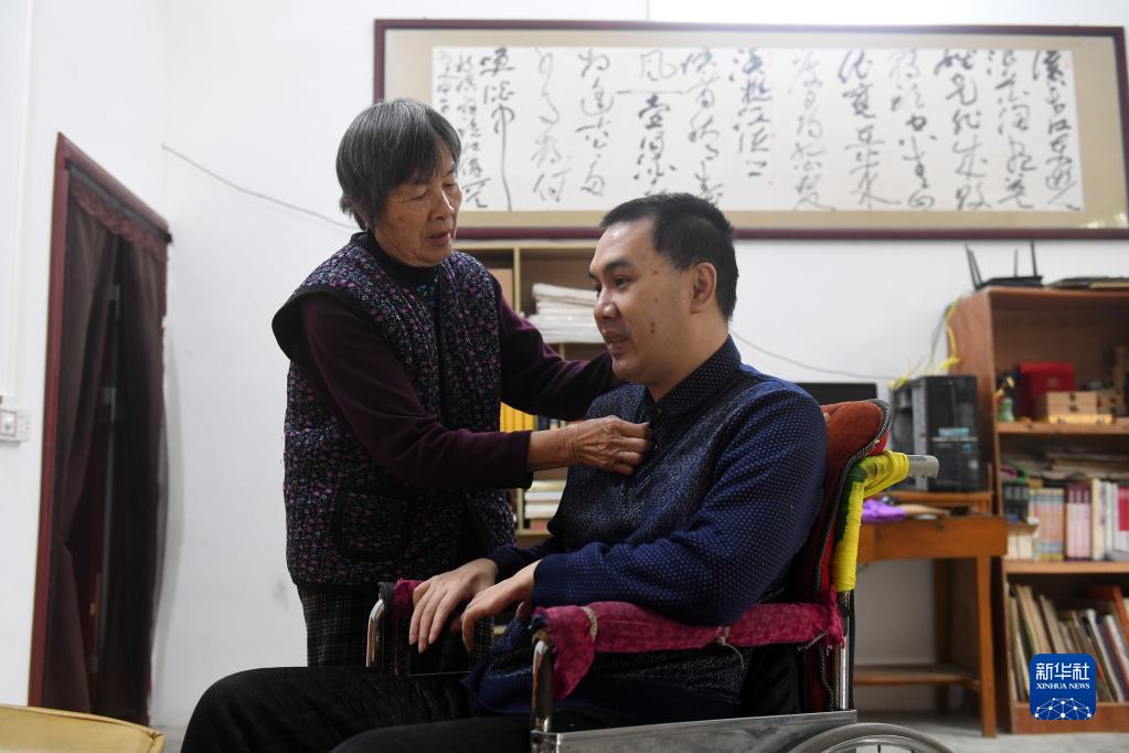 11月24日,在都安瑤族自治縣大興鎮九頓村那內屯家里,77歲的母親幫王金寶系扣子。王金寶受傷殘疾后,都是母親在照顧他。