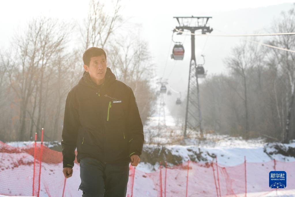 李連國巡檢索道運行情況(11月24日攝)。家住吉林市永吉縣口前鎮的李連國是一名農民。2021年冬天,他應聘成為吉林市冰雪試驗區北大湖滑雪度假區雪場(chǎng)運營(yíng)部的一名索道工,負責滑雪場(chǎng)索道的運行及檢修保養工作,為自己找到了冬日里增收的“新?tīng)I生”。