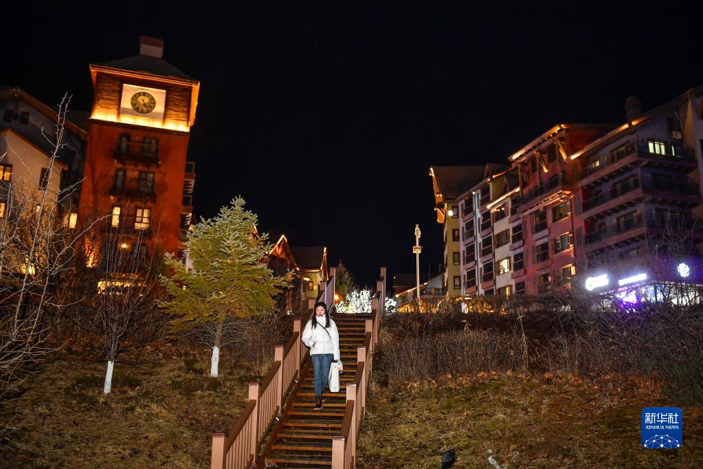 結束一天的工作,王爽前往班車(chē)點(diǎn)乘坐班車(chē)回家(11月20日攝)。吉林市萬(wàn)科松花湖度假區的前臺接待人員王爽家住在滑雪場(chǎng)山腳下的豐滿(mǎn)區段吉村。三年前,她辭去了在城里的工作,選擇來(lái)到距家里只有7公里的滑雪場(chǎng)工作?!氨┊a(chǎn)業(yè)前景廣闊,能把我們留在家鄉?!蓖跛f(shuō)。