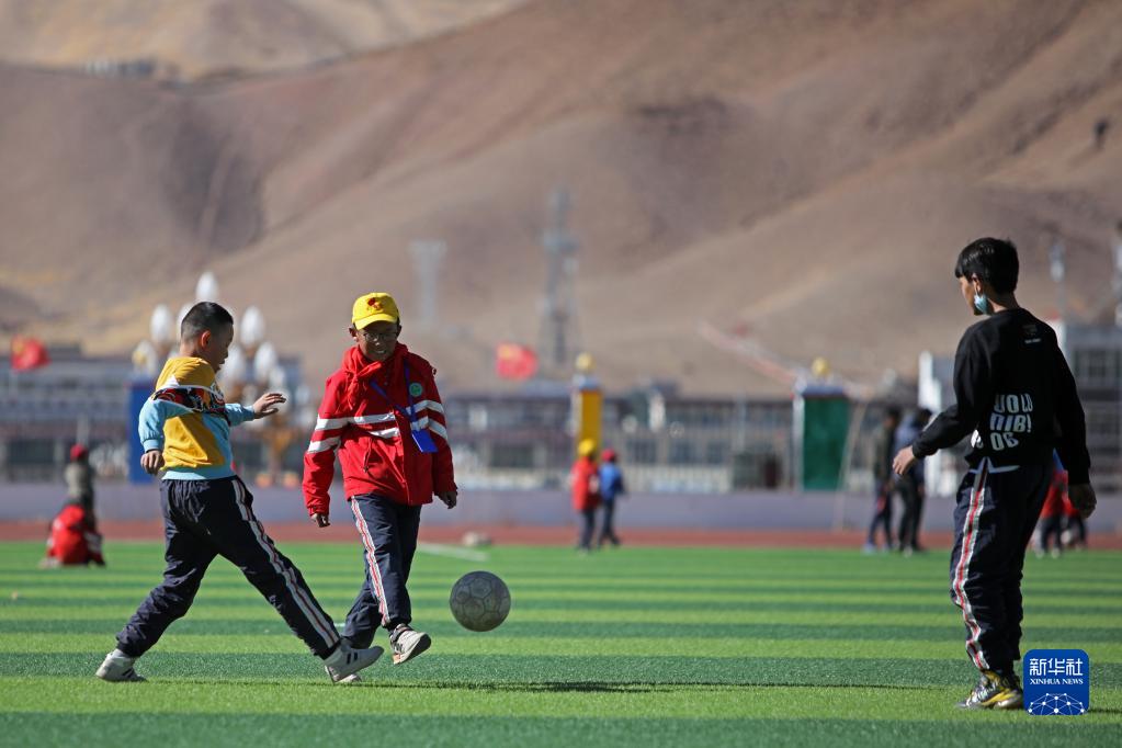 西藏阿里陜西實(shí)驗學(xué)校的孩子們在踢足球(4月11日攝)。