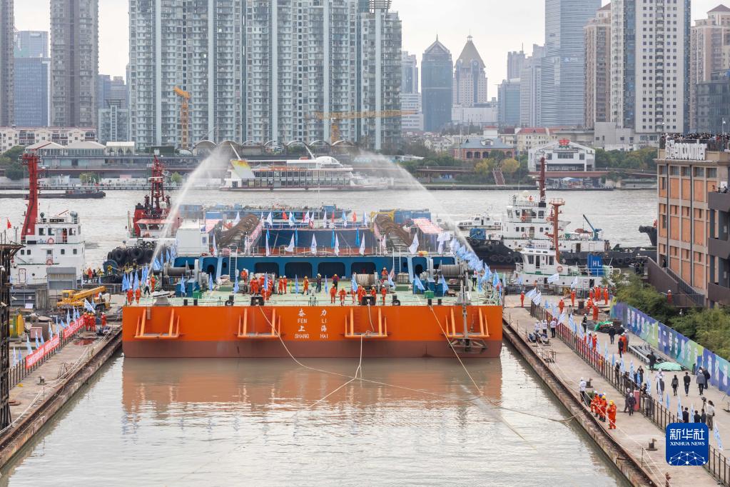 11月25日,“奮力”輪載著(zhù)長(cháng)江口二號古船進(jìn)入上海船廠(chǎng)舊址1號船塢,現場(chǎng)噴水慶祝。