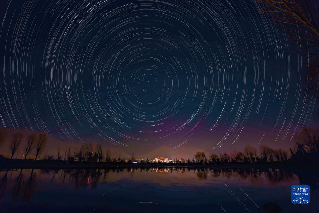 這是在拉薩市南山公園拍攝的以布達拉宮為前景的星軌照片(合成照片,11月21日攝)。